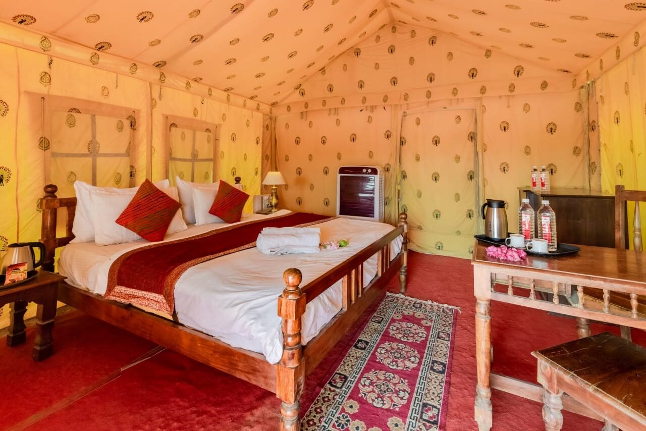 Choose our Deluxe Swiss Tent for the best budget-friendly desert camp in Jaisalmer, where every stay comes with warm hospitality, desert activities, and unforgettable views of the golden dunes.